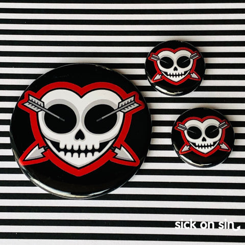 This fun take on the skull & crossbones motif features a heart-shaped skull being pierced by arrows.