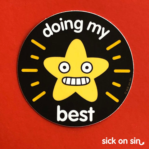 This listing is for ONE high quality die cut sticker featuring our cute original Doing My BestĀ design. It is made from thick, waterproof, durable vinyl with a permanent adhesive.