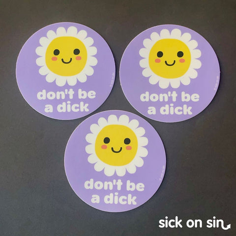 This listing is for ONE high quality die cut sticker featuring our cute original Don't Be A DickĀ design. It is made from thick, waterproof, durable vinyl with a permanent adhesive.
