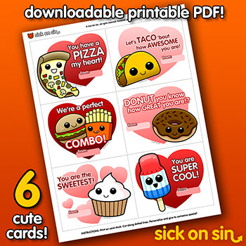 Show someone you care with these tasty treats! This is a set of 6 sweet little LoveĀ Cards featuring our cute food original designs. These printable cards are perfect for kids, teens or adults to give out to classmates, friends and crushes!