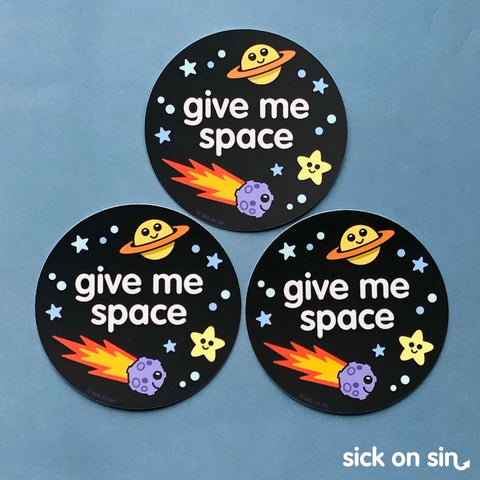 This listing is for ONE high quality die cut sticker featuring our cute original Give Me Space design. It is made from thick, waterproof, durable vinyl with a permanent adhesive.