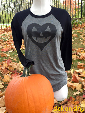 Calling all Halloween fans and fiends! Show your love for the best day of the year with this spooky cute carved pumpkin heart design on a unisex baseball-style raglan tee!