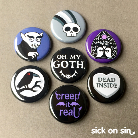 Weāve grouped a few designs together to make this themed set perfect for all you fellow children of the night! Get the pack as either 1 inch pins or 1 inch magnets - your choice!