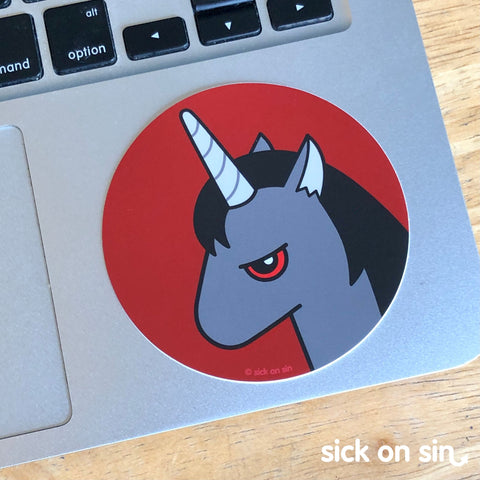 This listing is for ONE high quality die cut sticker featuring our cute original Evil Unicorn design. It is made from thick, waterproof, durable vinyl with a permanent adhesive.