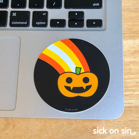 This listing is for ONE high quality die cut sticker featuring our cute original Pumpkin Rainbow design. It is made from thick, waterproof, durable vinyl with a permanent adhesive.