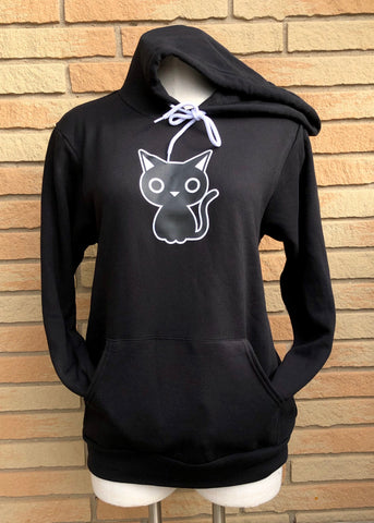 Get our popular Black Cat design on a black comfy hooded sweatshirt! This high quality pullover hoodie is perfect for wearing while strutting around town, lounging on the couch, hiking through the woods, sitting around the campfire, or anything in-between!