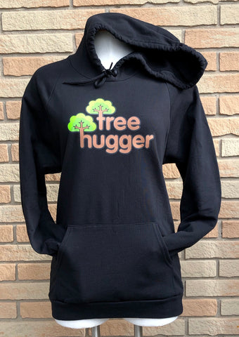 Get our fun Tree Hugger design on a black comfy hooded sweatshirt! This high quality pullover hoodie is perfect for wearing while strutting around town, lounging on the couch, hiking through the woods, sitting around the campfire, or anything in-between!